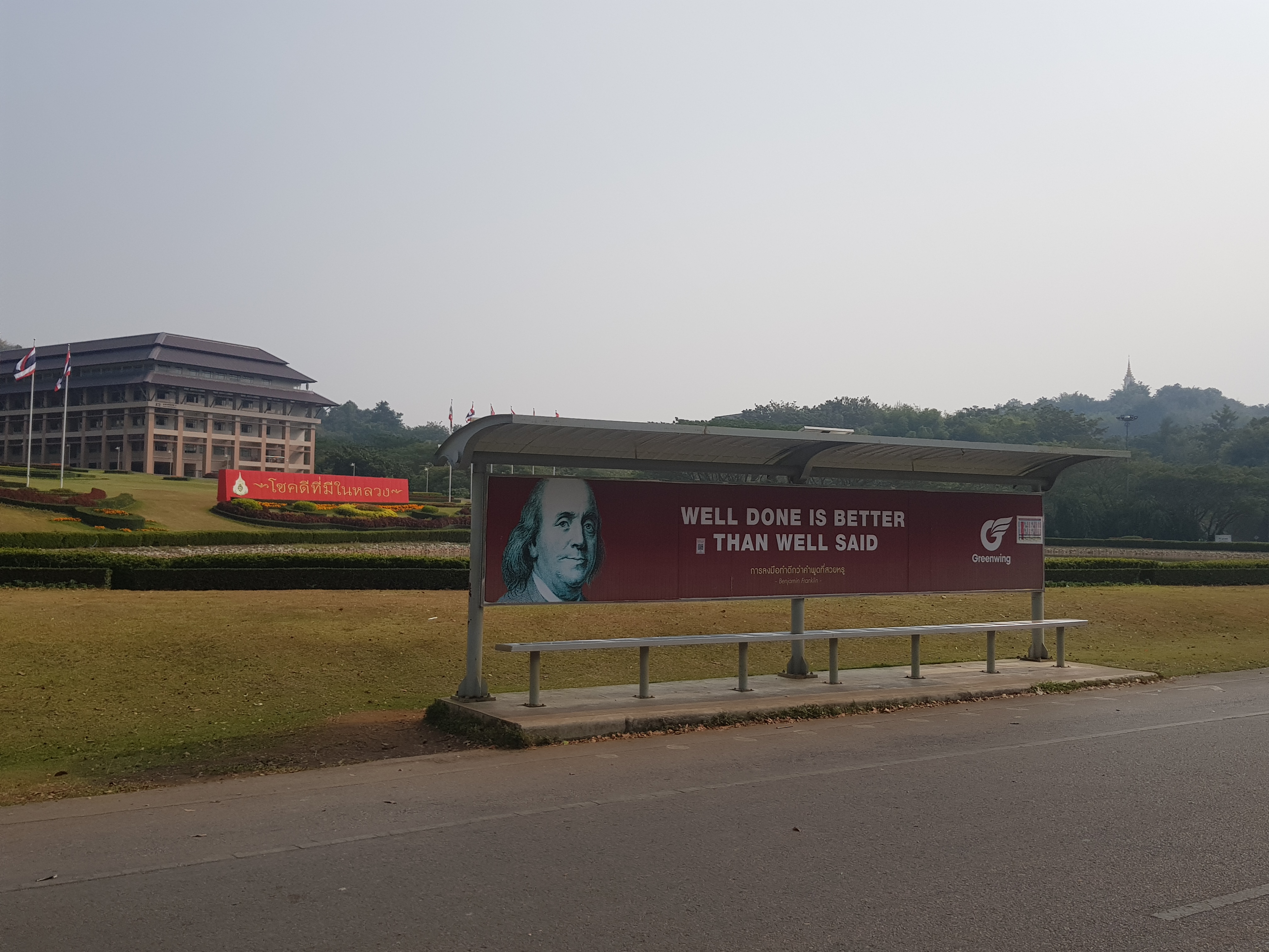 정문 쪽의 버스 타는 곳인 것 같은데 말보다 행동이 중요하다는 벤자민 프랭클린의 금언이 적혀있다.