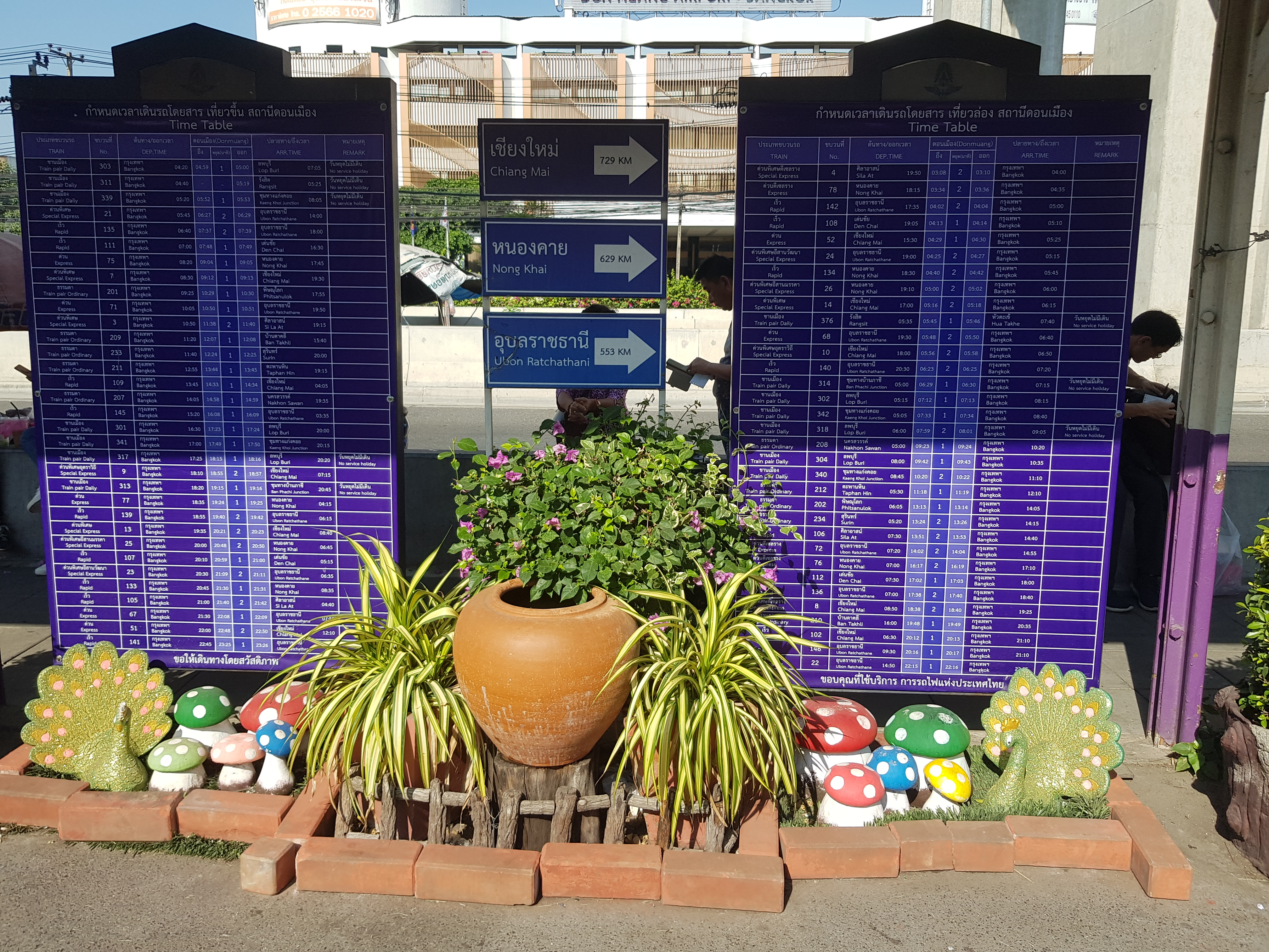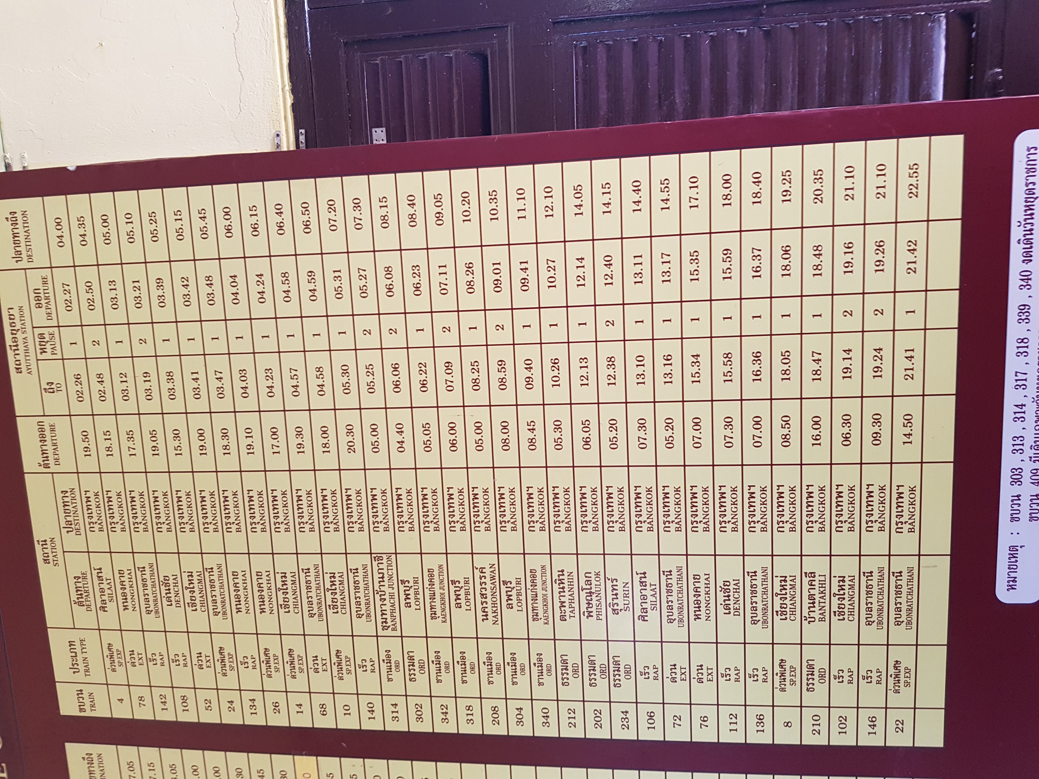중간에 농카이, 치앙마이 쪽이라는 화살표가 있고, 열차 시간표가 나와 있다.