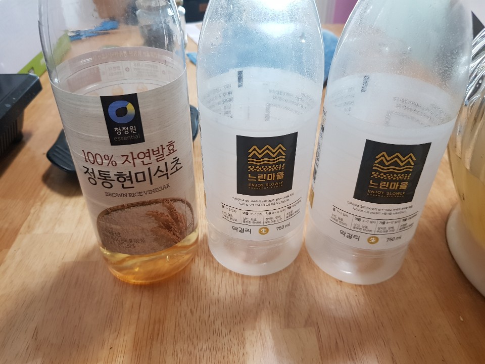 자연발효 식초 1병을 마트에서 사오고, 막걸리 750ml 2통과 막걸리 양의 1/2인 식초 750ml를 병에다 부어주었다.